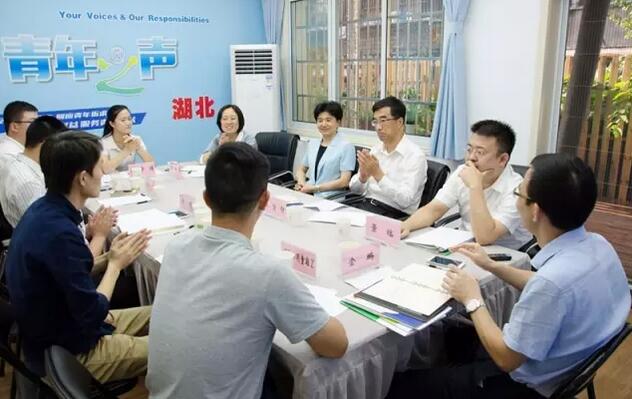 在团湖北省委文化传媒中心,秦宜智实地查看“青春湖北”微博微信、“青年之声•湖北”、“青楚网”等新媒体阵地建设情况,了解新媒体产品生产传播情况,并同在校大学生青马班成员、基层团干部、高校教师、青年网民代表进行了座谈交流。